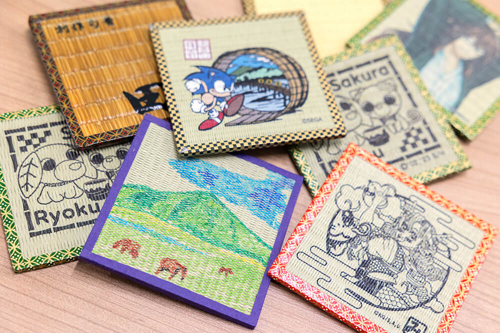 畳を使用したコースター、はがき、小物入れ等 畳グッズを製作しています。畳表への印刷技術を使い、 ロゴや絵柄等のデザインを自由に印刷することが可能です。